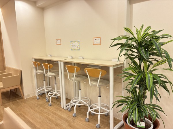 患者様からのご要望を受け、待合室にカウンターを設置いたしました。カウンターテーブルには荷物を掛けられるフックも備え付けております。お仕事や読書など、お待ち時間にぜひご活用ください。